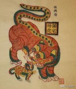虎纹较为常见的题材是镇宅神虎纹。镇宅神虎纹是以虎纹为表现主体的纹样,有的是一只凶猛的老虎正在下山,作回头望山状,也有的是大小两只老虎在嬉戏,还有的是老虎驱除五毒的图案。镇宅神虎纹常被绘在门画或民间剪纸上,有-些建筑大门上也常绘有镇宅神虎纹样。