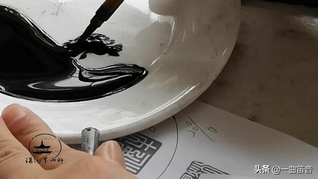 4,将小楷笔蘸凉好的浓墨,慢慢的填到我们之前用铅笔双钩好的印稿上,这个过程不能着急,一定要细心,按照笔顺慢慢填写,写好的印稿由于墨很浓,会起皱,不用担心。